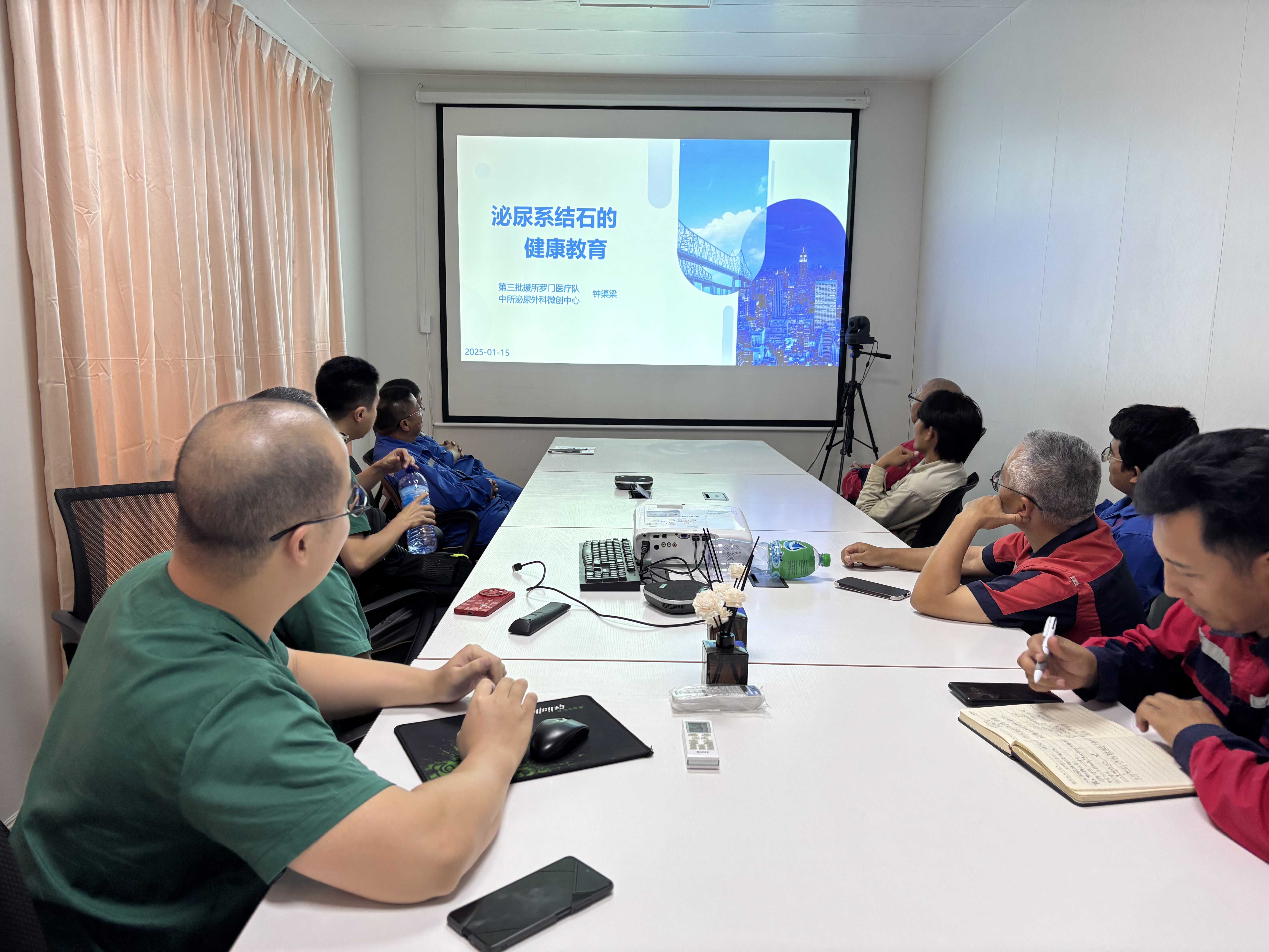 本次义诊活动由感染科主任医师穆茂队长带队,泌尿外科钟渠梁副主任医师、心内科韦波副主任医师、针灸科徐明主治医师、李丹茂主治医师、肾内科唐英骞主治医师等参加。医疗队穆茂、钟渠梁、唐英骞分别为项目部员工开展了流行性感冒、泌尿系统结石、慢性肾病和痛风的防治知识讲座。义诊活动从上午10点持续到下午5点,共计为矿区员工提供医疗服务300余人次,包含血糖、血压检查、内外科、针灸治疗,免费发放药物和健康教育讲座等服务,得到项目员工的高度赞许和认可。