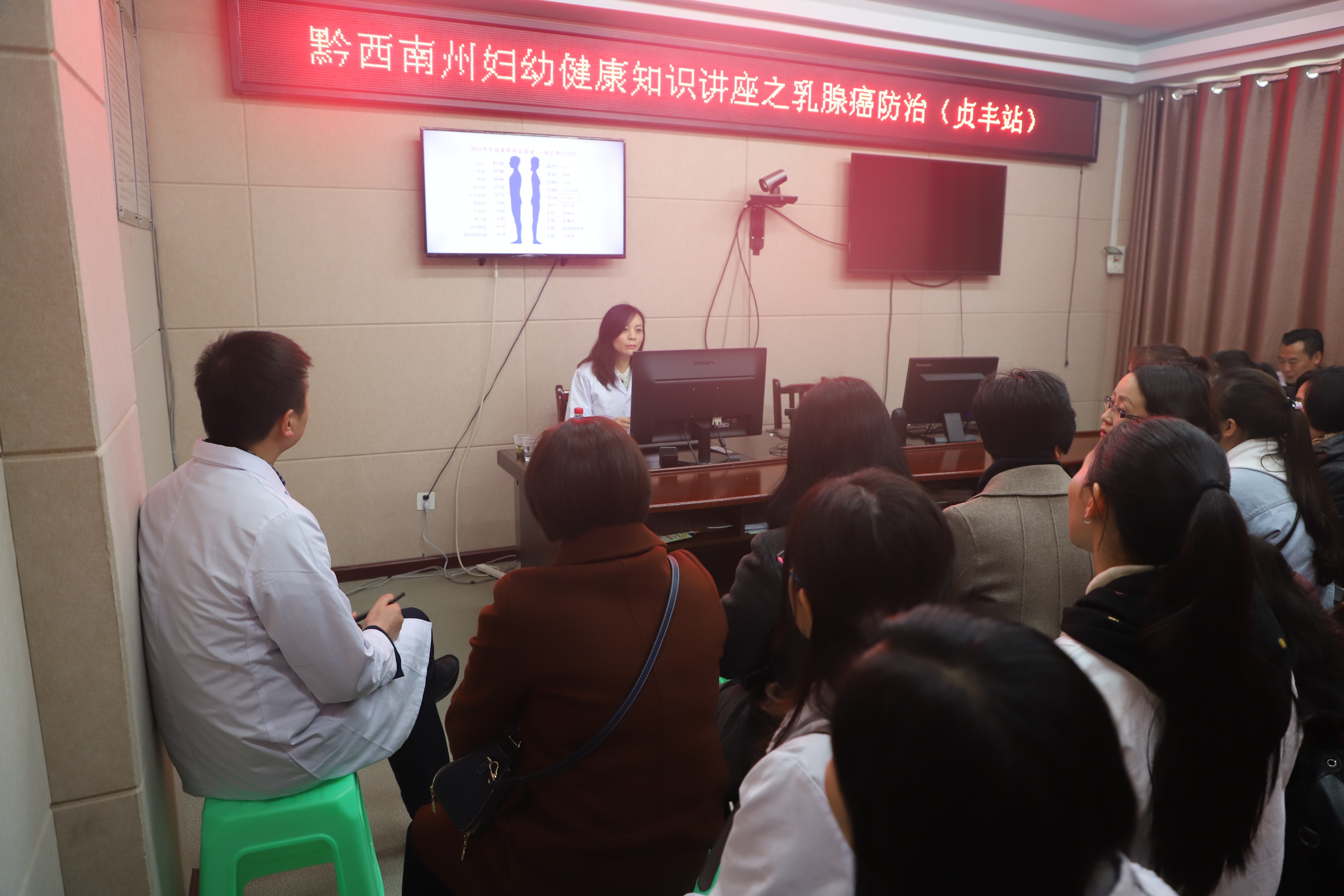 活动现场吸引了众多安置区的妇女群众前来咨询问诊,贵阳市妇幼保健院乳腺科刘蜀博士团队、黔西南州妇幼保健院和贞丰县妇幼保健院的医护人员为妇女群众测量血压、妇检、B超、询问病症、分析病因,提供治疗建议。当天,刘蜀博士还结合实际开展了“两癌”健康知识讲座,向安置区妇女群众讲授乳腺癌、宫颈癌防治知识,帮助他们增强认识,提高生殖健康和自我防病意识,做到“早发现、早诊断、早治疗”,保持身体健康,远离疾病。