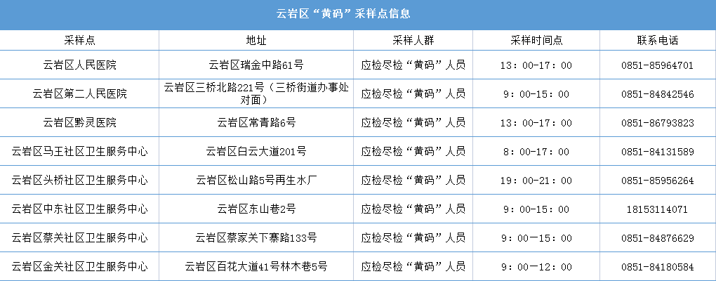 为切实做好疫情防控工作,方便“黄码”人员及时就近进行核酸检测,目前,云岩区开设8个核酸采样点为“黄码”人员提供免费核酸采样服务。