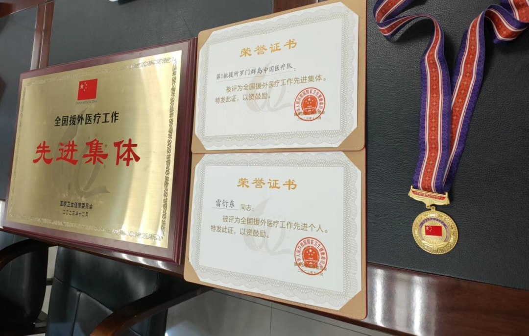 2023年12月29日,中国援外医疗队派遣60周年纪念暨表彰大会在京举行,大会表彰了30个全国援外医疗工作先进集体和60名先进个人。贵州承派组建的第1批援所罗门群岛中国医疗队获“全国援外医疗工作先进集体”荣誉称号,第1、2批援所罗门群岛中国医疗队队员、贵州医科大学附属医院副主任医师雷衍东获“全国援外医疗工作先进个人”荣誉称号。