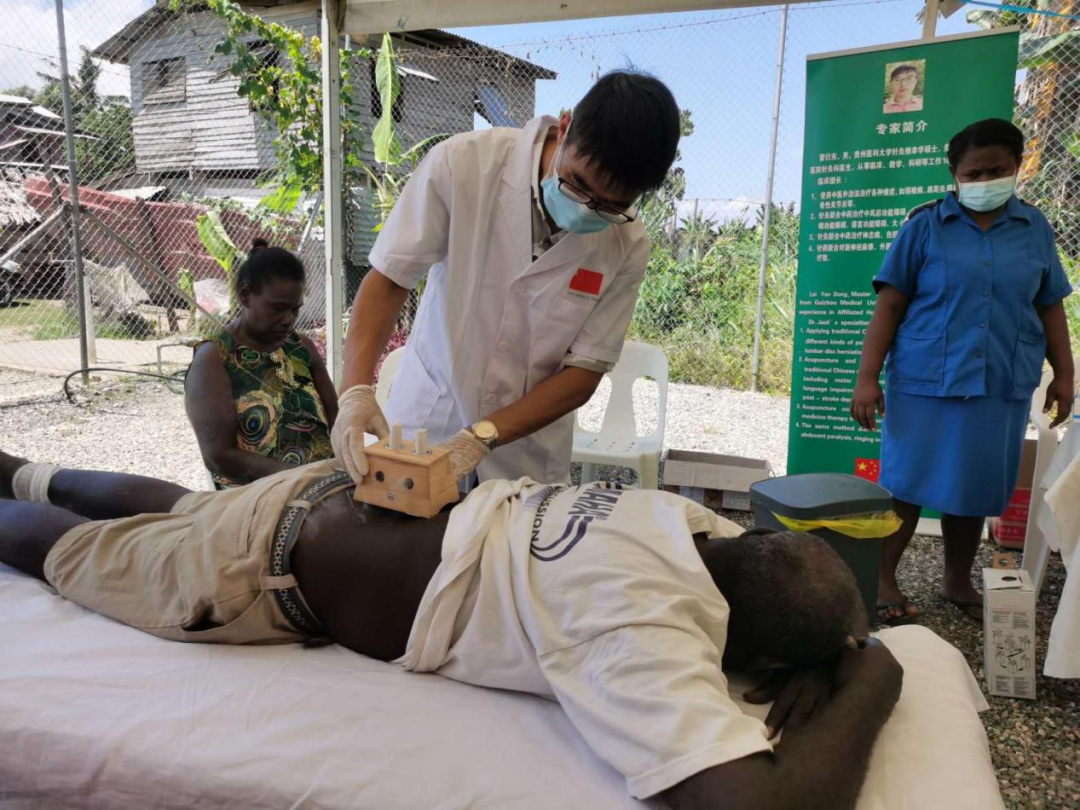 雷衍东在社区义诊时为患者进行针灸+艾炙治疗。2023年3月底,第1批援所罗门群岛中国医疗队载誉归黔,雷衍东则选择了留任第2批,与其他7名第2批队员一起,继续开展工作。