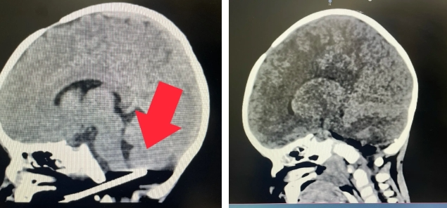 患儿啵啵(化名)在玩弄发簪时不慎被刺入口内,当即哭闹不止,父母立即将其送往当地医院就诊。颅脑CT显示,簪子刺入了啵啵的脑深部,且脑干及小脑受累。经当地医生建议,啵啵一家在当地医务和消防人员的护送下连夜赶往上海儿童医学中心贵州医院。