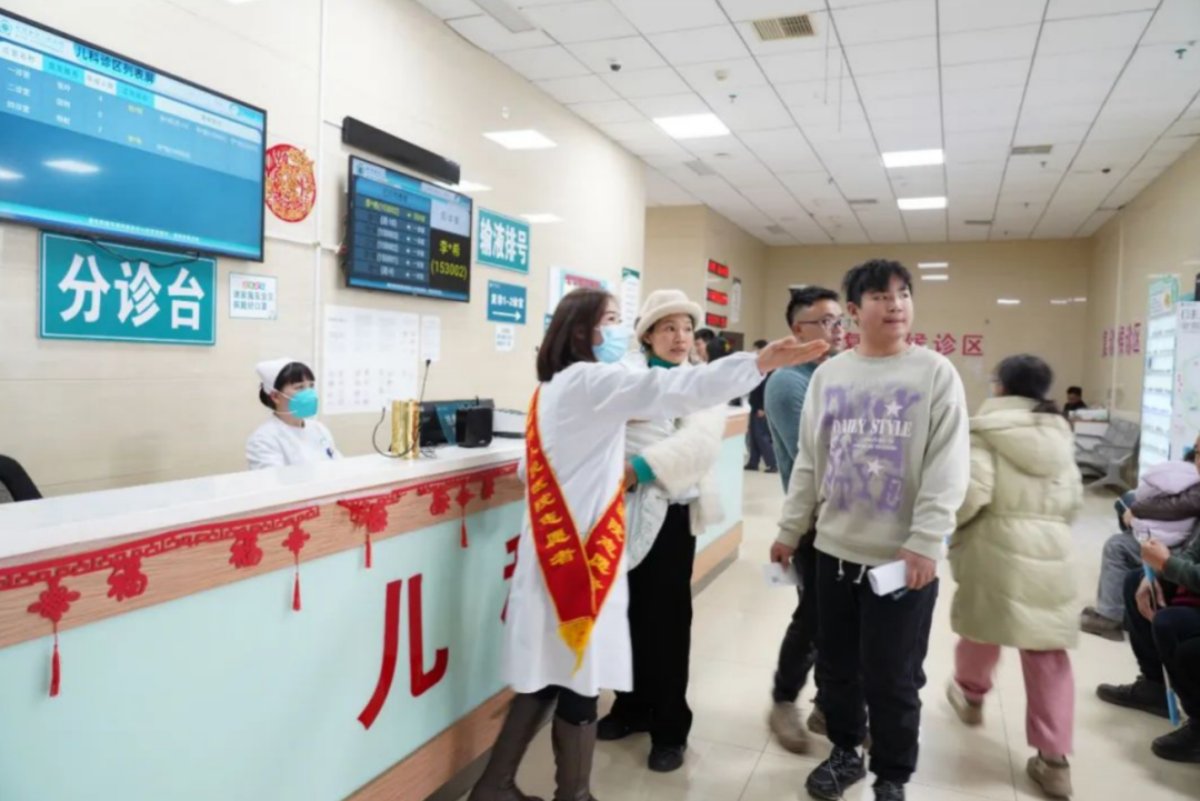 为确保每位患者顺利就诊,黔西南州人民医院党员志愿者积极行动,服务患者。(黔西南州人民医院 王璟)
