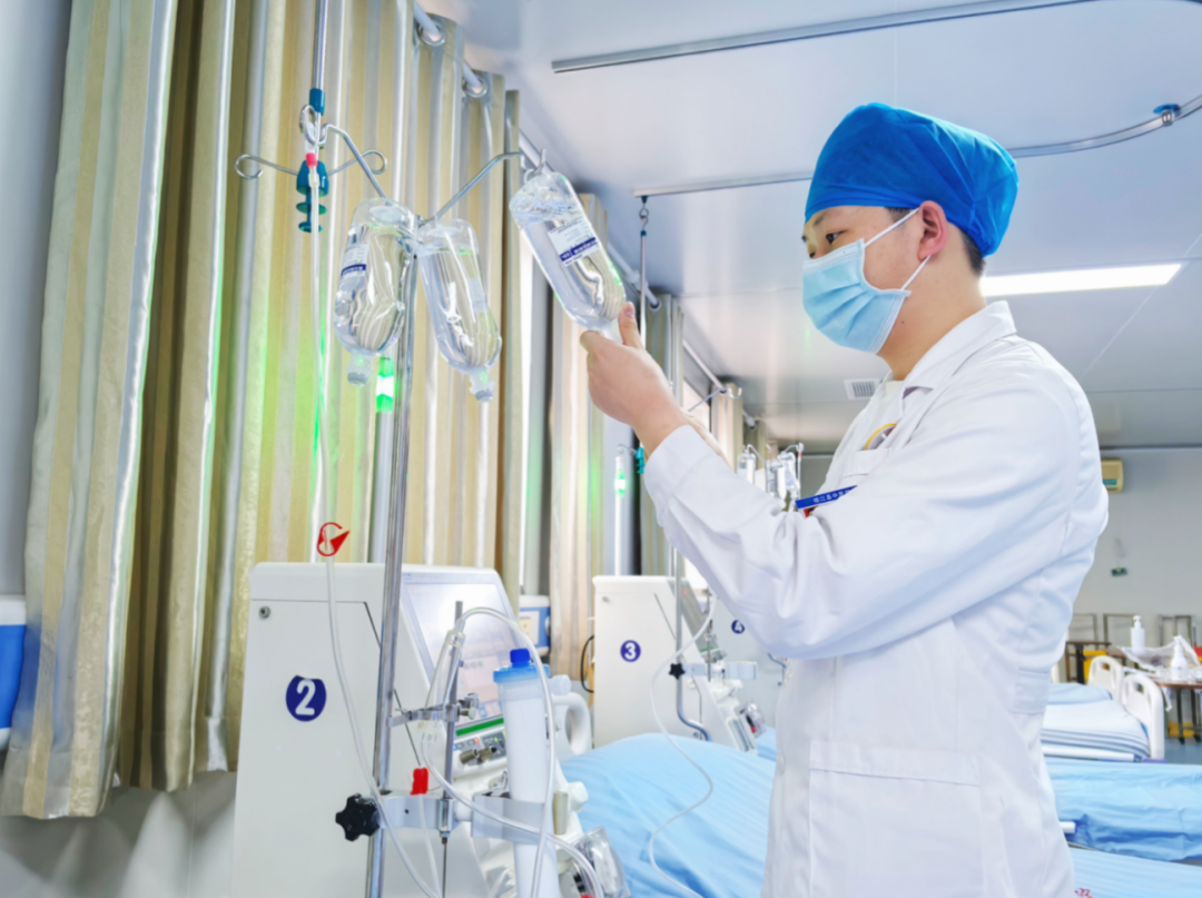榕江县中医院血透室护士为患者做透析前的准备。(榕江县中医院 赖如希)