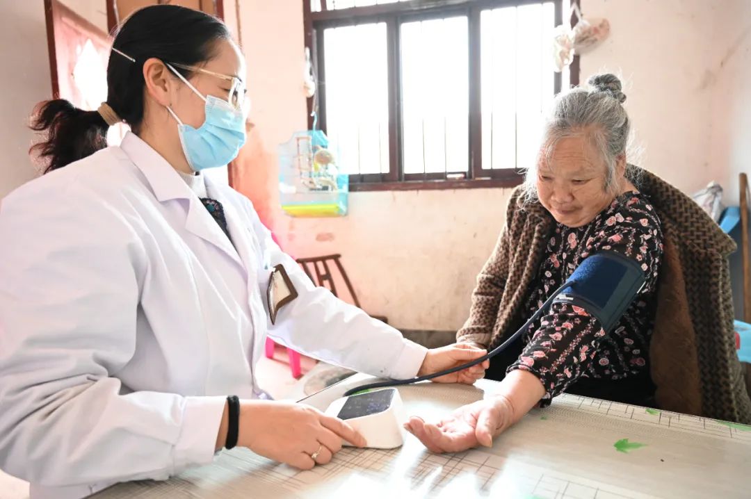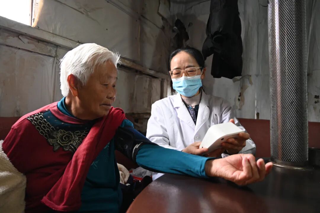 一行人坐定,杨世霞开始为两位老人逐一测量血压,询问服药情况。“你最是细心,隔三岔五来。我们肯定是按时服药的,就是之前脚上伤的地方,天气冷了有点胀痛。”龙启莲说。