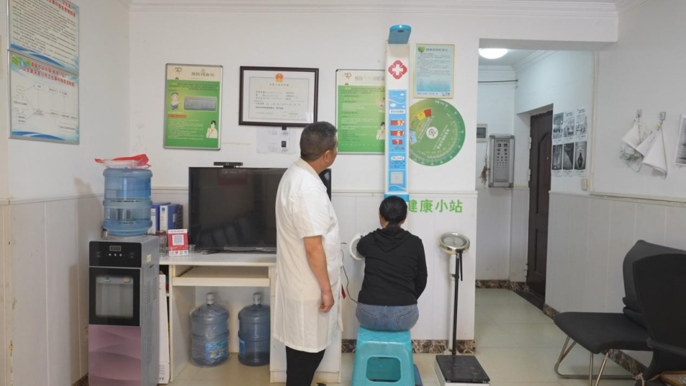 在清镇市站街镇枫渔小区第二卫生室里,居民李女士正在体验新安装的智能化健康一体机。“测身高体重、量血压一键搞定,还能语音播报,一听就明白。”她笑着说道。