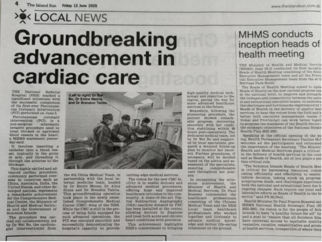 近日,中国援所医疗队在中国援建的所罗门群岛国家转诊医院综合医疗中心(CMC)心血管导管室成功为一名当地患者实施了微创冠状动脉介入治疗,标志着所在心血管疾病介入治疗方面取得了历史性突破。6月13日,所方媒体太阳报头版头条以《心血管疾病治疗突破性进展》为题、所罗门卫生部官方媒体以《所罗门首例,心血管疾病治疗里程碑式创举与突破性进展》为题,分别对该手术进行了报道。