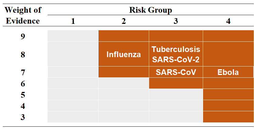 图1 SARS-CoV-2气溶胶传播(证据重量)与感染后果(风险组)的综合权重评级。