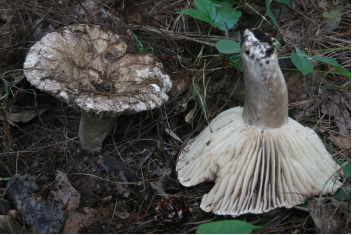 亚稀褶红菇的菌体中等大小,菌盖表面呈灰白色、浅灰色至煤灰黑色,成熟后常向上反卷,边缘无条棱。菌肉呈白色,受伤后易变红色而不再变黑色。菌褶白色,受伤后变红色,菌褶厚,稍密至稍稀疏,不等长,脆而易碎,直生(菌褶与菌柄相连)。菌柄粗短,圆柱形,污白色、浅灰白色至灰黑色。
